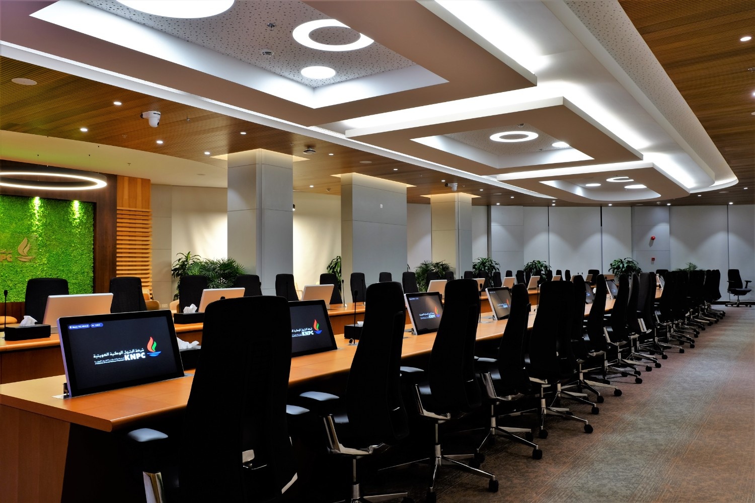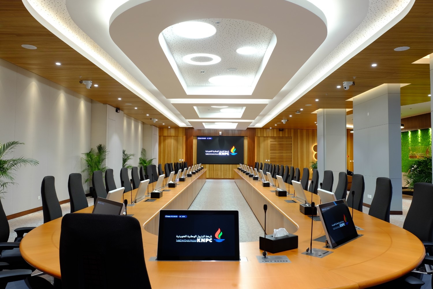 The 51-seat room features state-of-the-art A/V solutions with automated controls, retractable displays, advanced conferencing capabilities, and seamless presentation tools — setting a new standard for corporate environments in Kuwait.